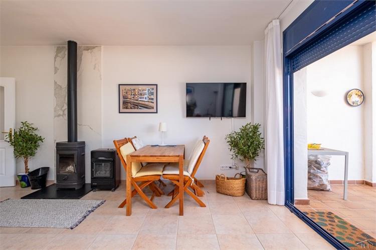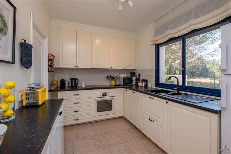 Entrance hall, large kitchen with electric hob and oven, fridge, dishwasher, washing machine, microwave and coffee machine, toilette. Attractive sitting/dining room with exit to covered terrace and garden. Tv.